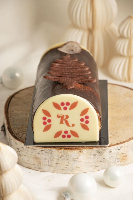 Notre bûche Duo de Chocolats est une véritable ode aux multiples saveurs du chocolat. Elle marie harmonieusement une mousse onctueuse au chocolat au lait 36%, un insert riche en chocolat noir pour une touche d’intensité, et un moelleux au chocolat qui fond en bouche.