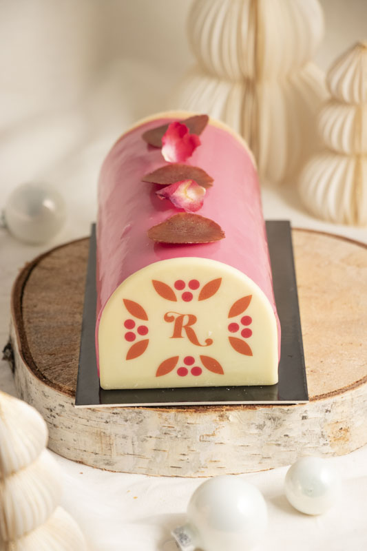 La Duchesse, notre bûche emblématique qui allie la saveur délicate et fruitée d’une mousse framboise à l’intensité d’une mousse chocolat noir 52%. Un biscuit madeleine au chocolat et un praliné feuilletine viennent compléter l’ensemble.